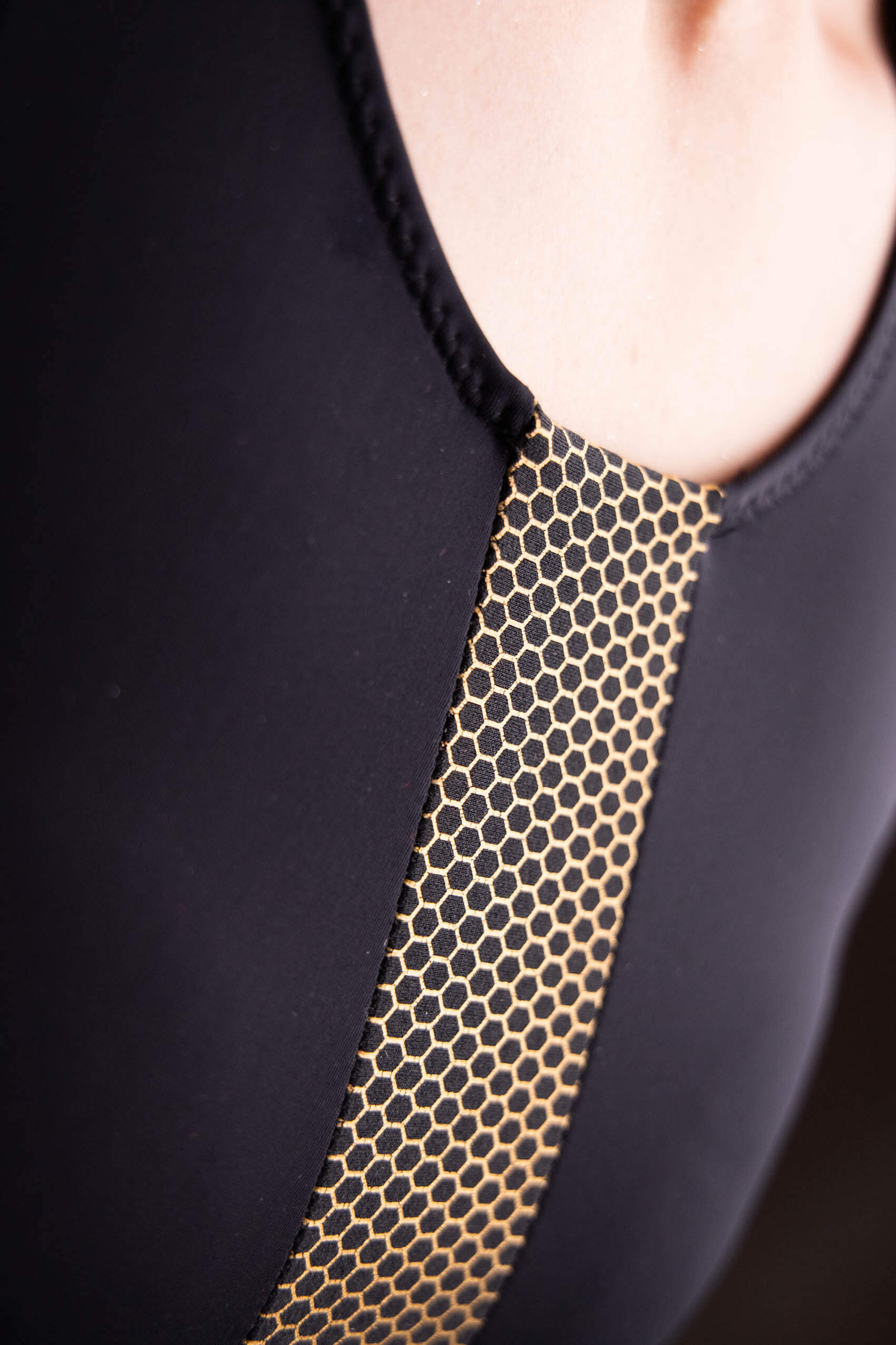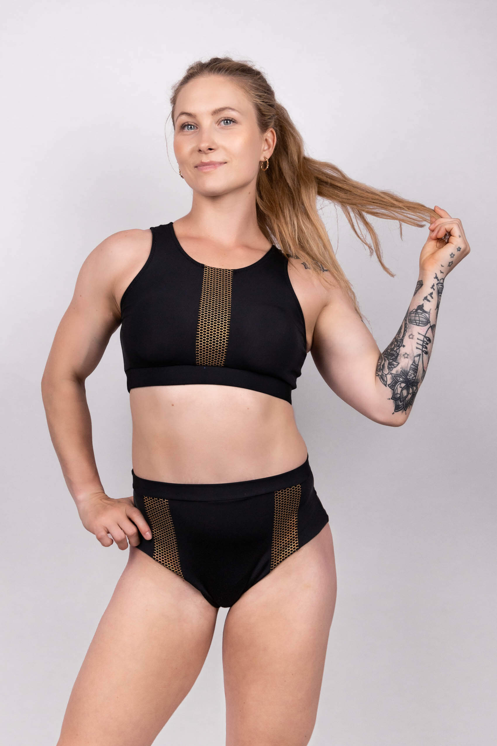 Komplet z dodatkiem złotego wzoru, szorty z marszczeniem, top posiada wkładki. Prać ręcznie w letniej wodzie