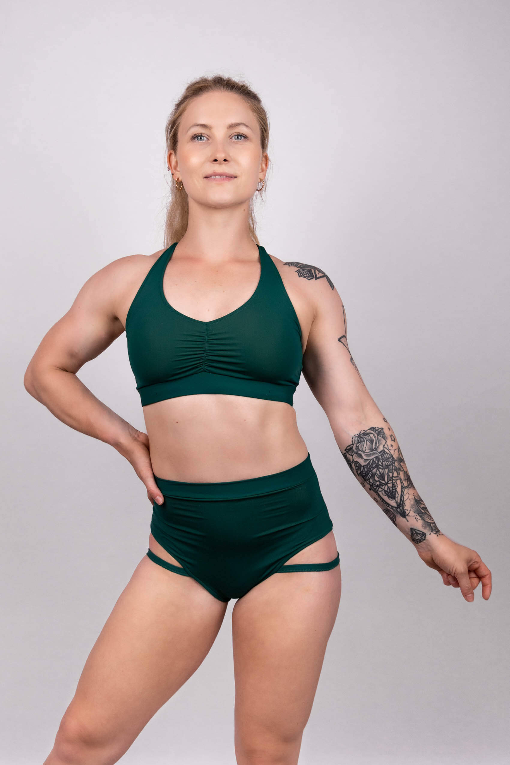 Top ze skrzyżowanymi ramiączkami, szorty z marszczeniem podkreślającym pośladki. Top posiada wyjmowane wkładki. Prać ręcznie w letniej wodzie